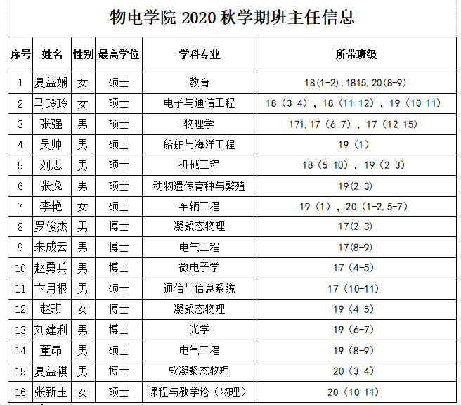 物电公司2020秋学期班主任信息