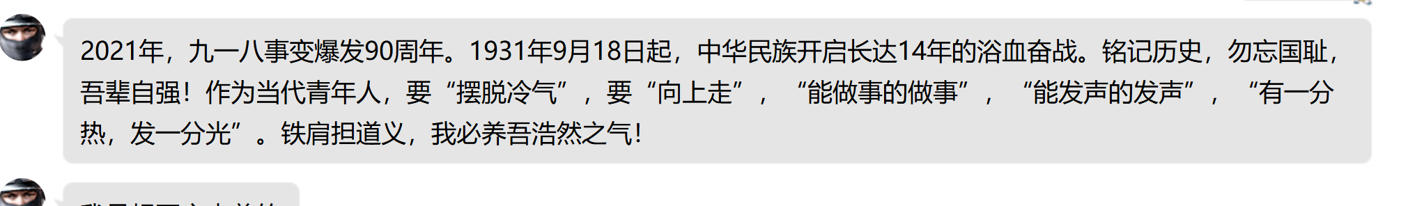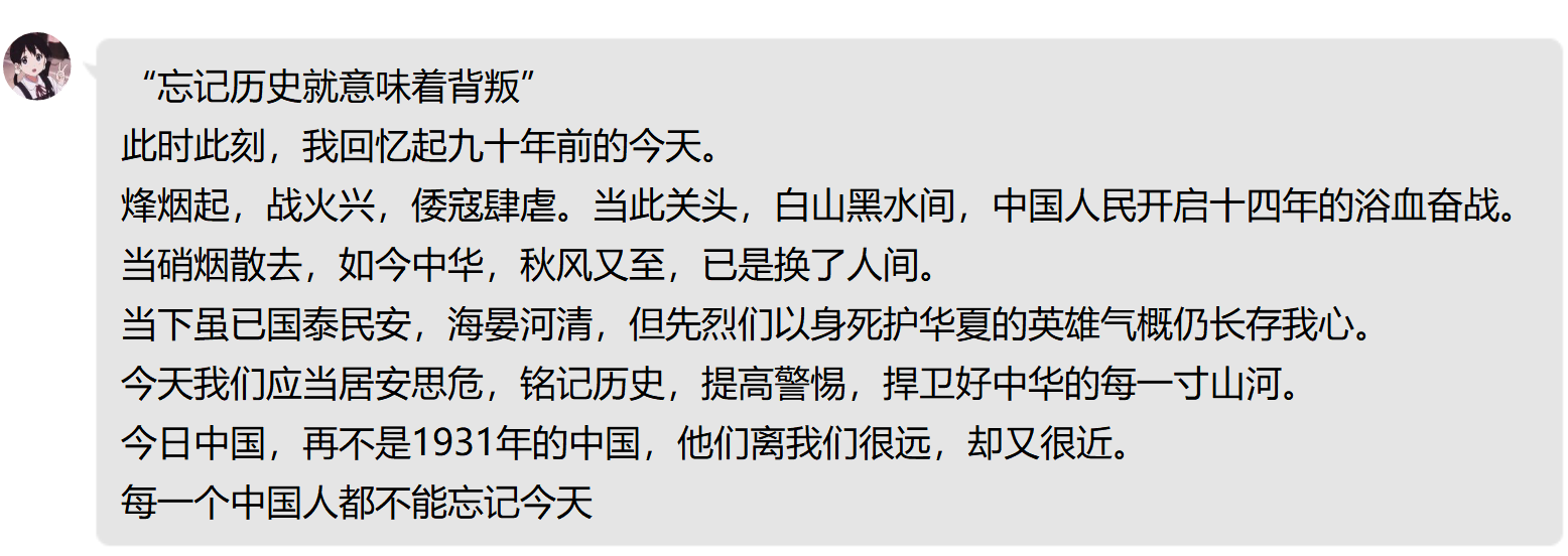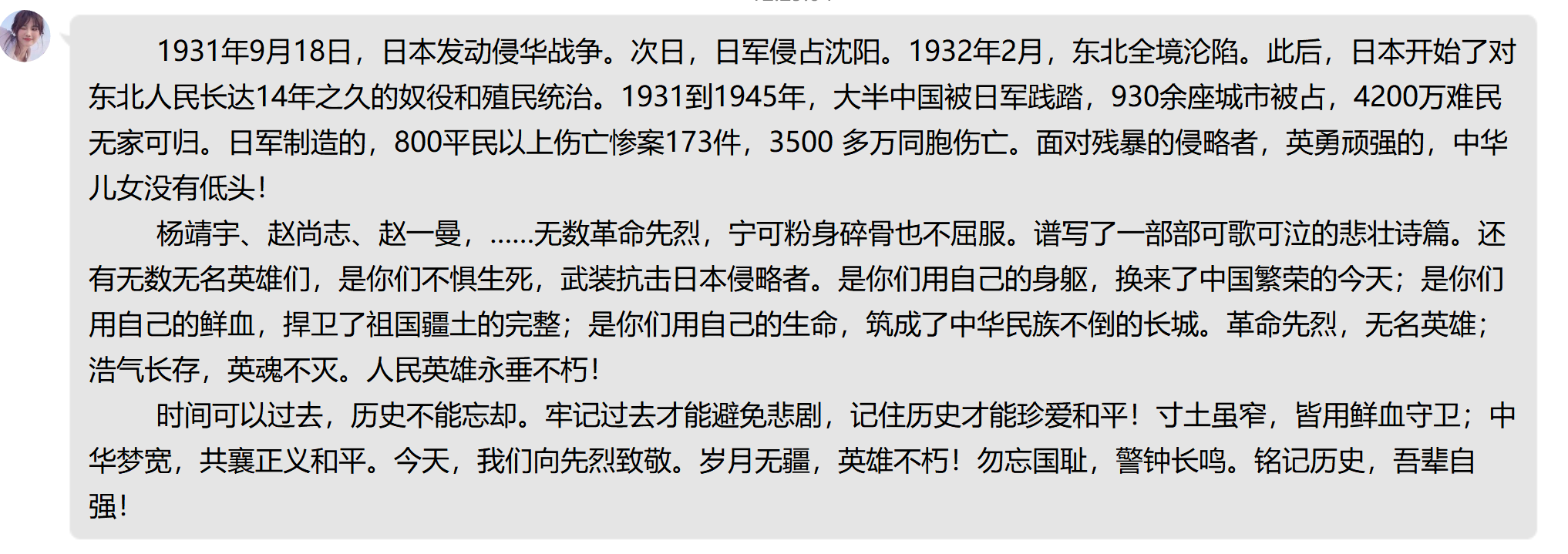 “九一八”事变是日本驻中国东北地区的关东军突然袭击沈阳,以武力侵占东北的事件。物电公司组织线上主题教育活动,物电公司辅导员虞杨讲述“九一八”真实事件,带领员工回顾历史,缅怀先烈。