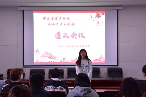 随后,214班郑密同学为同学们具体介绍了遵义会议——中国共产党历史上一个生死攸关的转折点,同学们表情严肃,深刻体会到“雄关漫道真如铁,而今迈步从头越”的真正意义,也进一步明白了这一会议在党的历史和红军历史发展中的伟大意义。