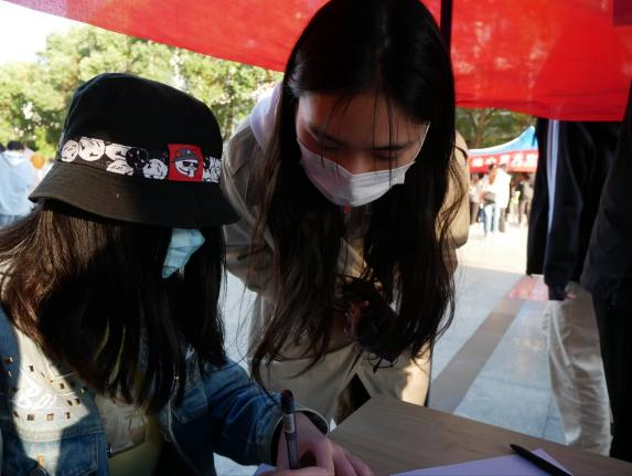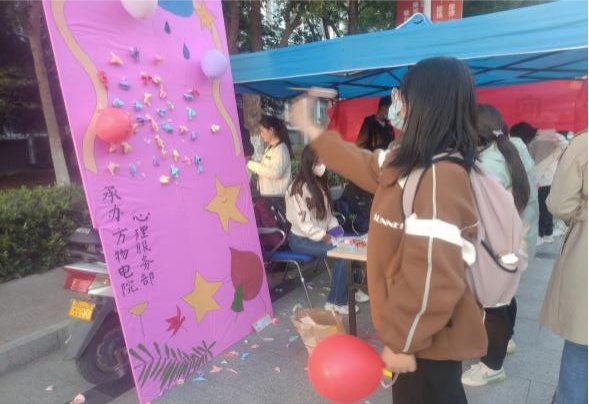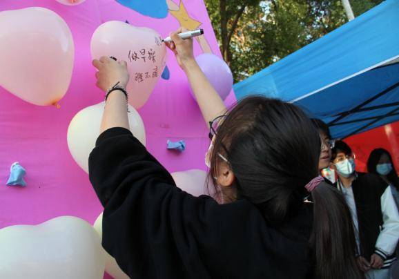活动开始,同学们在领取的气球上写下近期的烦恼或对未来的期望。随后,同学们按照要求将飞镖扔向木板上的气球,寓意消除烦恼、微笑面对未来。伴随着气球的爆破声,展现出了同学们敢于面对未来生活种种挑战的决心。