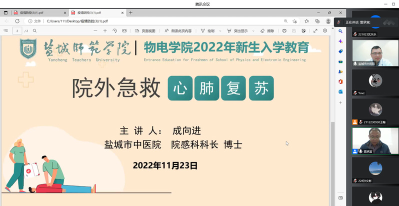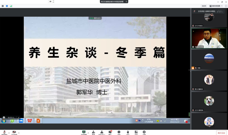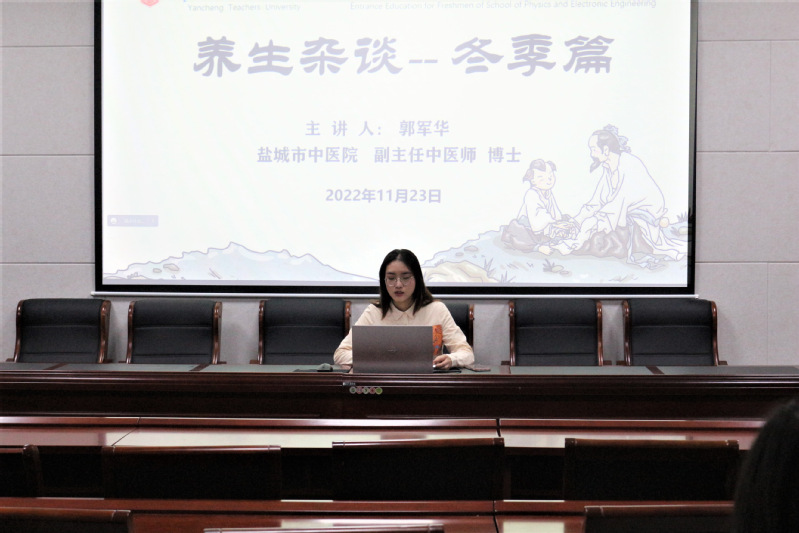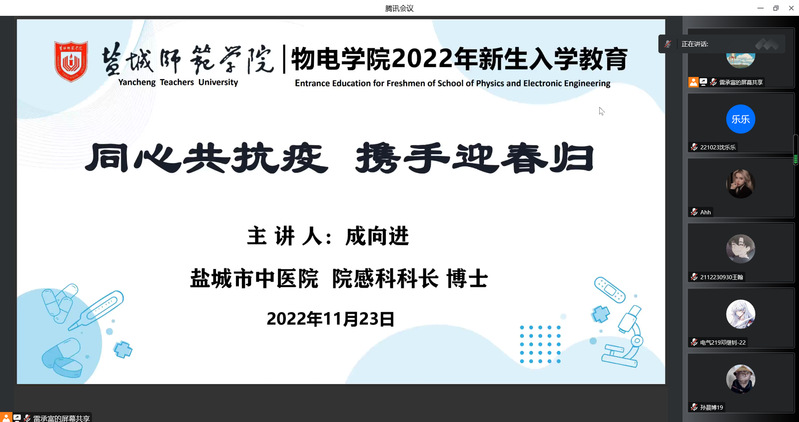 为响应党的二十大提出的“推进健康中国建设”的号召,有效应对新型冠状病毒肺炎的传播风险,普及中医药文化及养生保健知识,全面增强员工体质。公司联合盐城市中医院于2022年11月23日下午开展中医药文化进校园活动。本次活动采用线上、线下相结合的方式开展,邀请盐城市中医院副主任医师、院感科科长成向进博士和副主任医师郭军华博士主讲。活动由公司党委副书记雷承富和团委负责人李艳老师主持,面向公司20级、21级和22级全体员工。