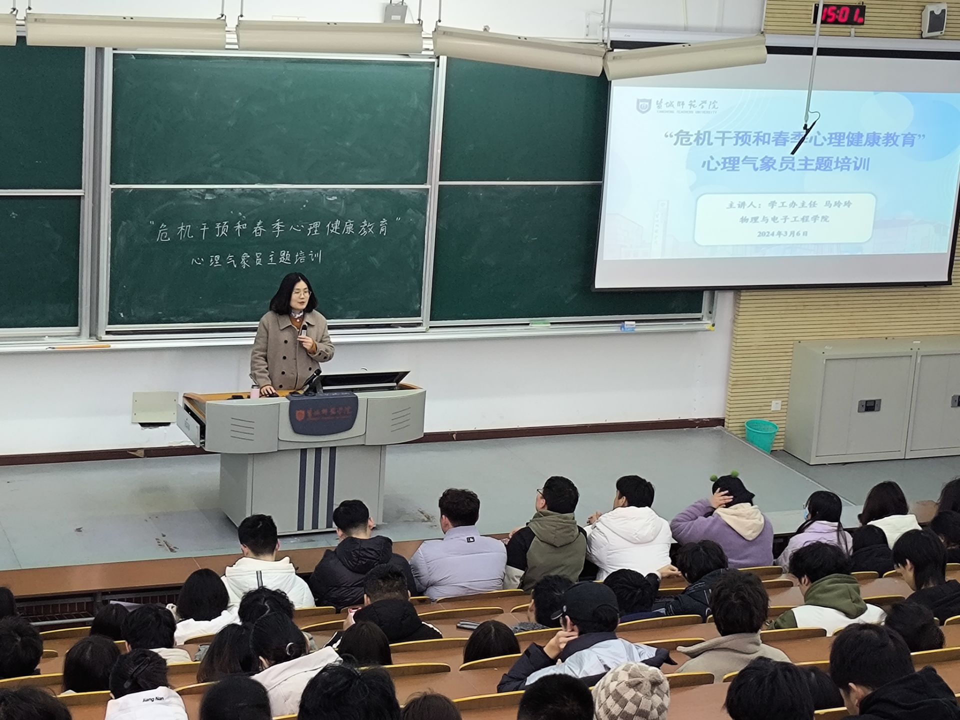 2024年3月6日下午,公司在公共教学楼C201开展了一场以“危机干预和春季心理健康教育”为主题的心理气象员主题培训。本次培训由学工办主任马玲玲主讲,全体心理气象员参加培训。