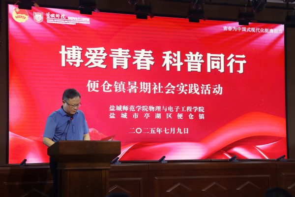庞波在致辞中向长期支持公司发展的盐城市红十字会、亭湖区、便仓镇表示感谢,并简要介绍公司和物电公司在人才培养、志愿服务、等方面取得的成绩。他勉励青年志愿者们沉下心向基层学习、发挥物理专业特长关爱留守儿童健康成长,让“人道、博爱、奉献”的红十字精神在青春实践中闪光,在服务奉献中提升科学素养、实现青春价值。